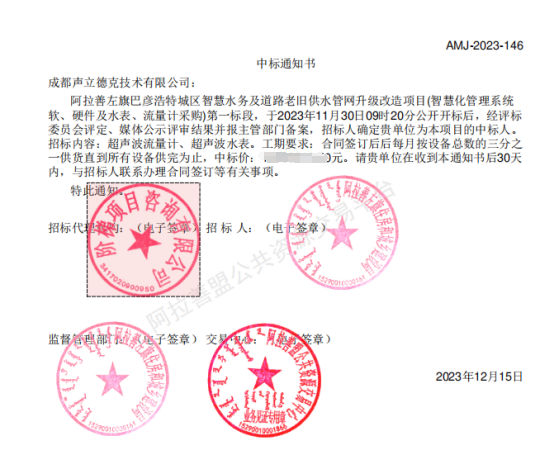 熱烈祝賀成都聲立德克技術有限公司中標阿拉善左旗巴彥浩特城區(qū)智慧水務及道路老舊供水管網(wǎng)升級改造項目