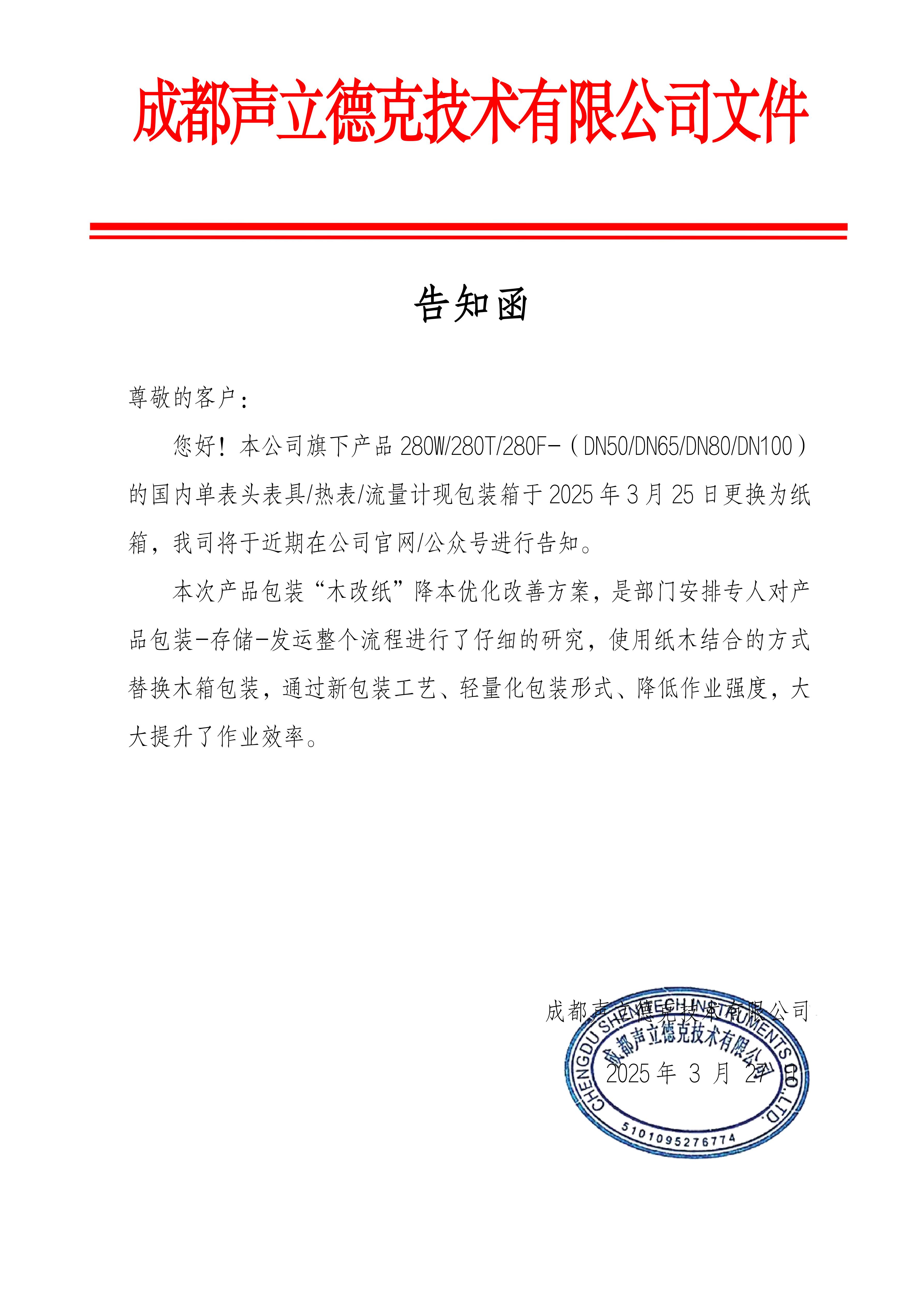 您好!本公司旗下產(chǎn)品280W/280T/280F-(DN50/DN65/DN80/DN100)的國內(nèi)單表頭表具/熱表/流量計現(xiàn)包裝箱于2025年3月25日更換為紙箱,我司將于近期在公司官網(wǎng)/公眾號進行告知。